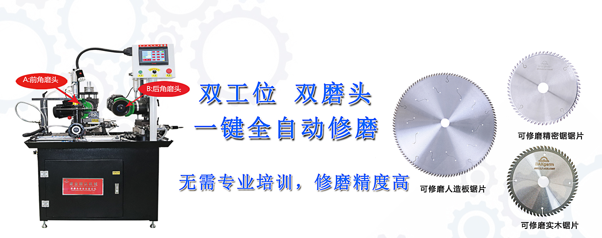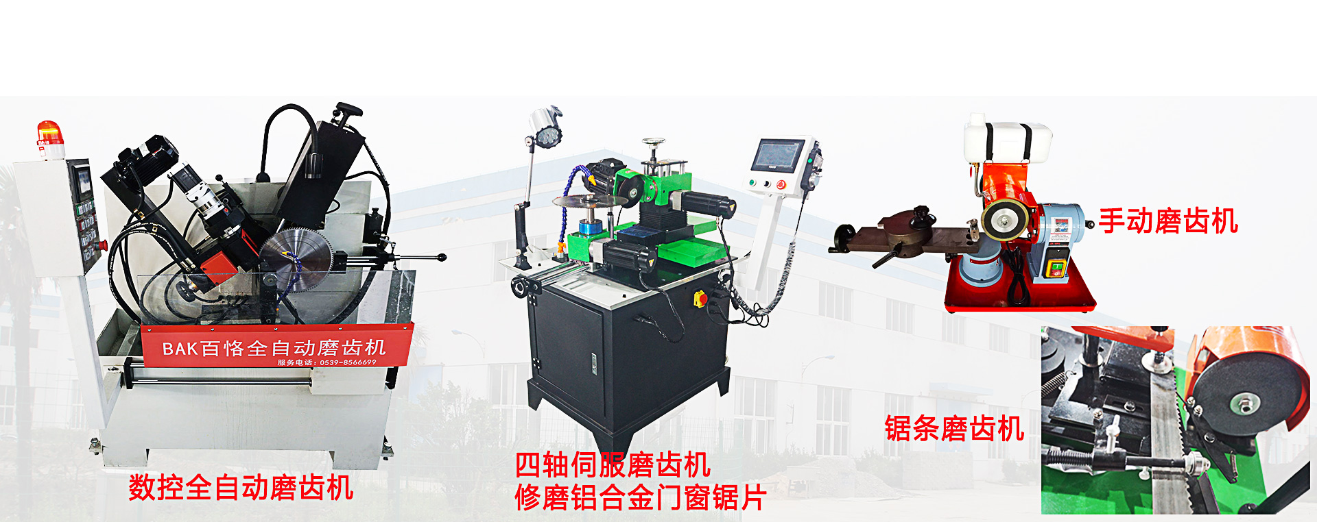 主營產品:磨鋸機,鋸片磨齒機、全數控前后角磨齒機、全數控雙磨頭磨齒機、全自動前后角磨齒機、圓鋸片磨齒機、磨刀機,高檔涂膠機、合金鋸片、金剛石鋸片等人造板機械設備